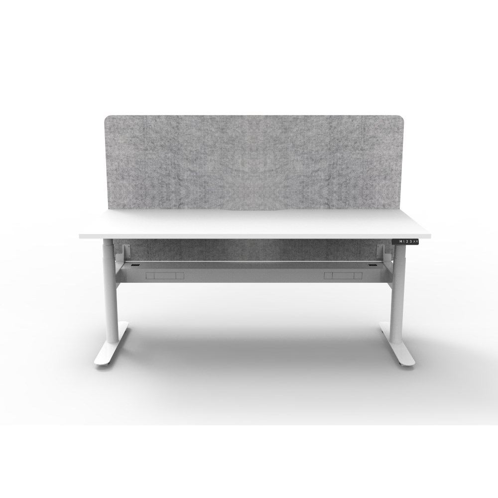 Natural White worksurface with rigid edging and 50mm scallop cable cut out. E0 rated 25mm top. White Satin powder coat round-leg frame. Eco screen and cable tray. Overall: 1800W x 750D x 620-1270mmH. Overall height including screen: 1330mmH. Marble Grey Eco Panel Screen 1800W x 900H x 27mmT. Fully ducted cable tray with punchout for power and data to be fitted to either external or internal of frame. Column Size: 70mm diameter. Digital control panel with 3 preset positions, LED display, keypad safety lock and reminder alarm. Anti-collision and anti-tilt technology with adjustable levelling feet. Noise emission: