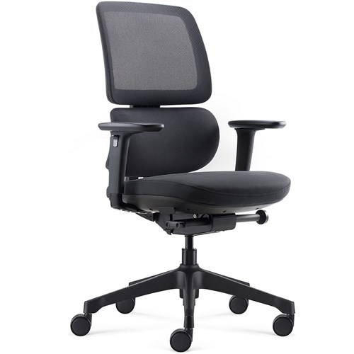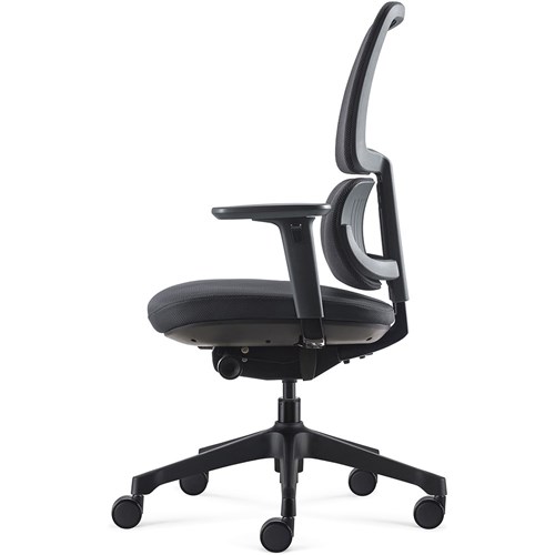 A stylish and ideal chair for any type of work environment. The chair moves with you and has 4 locking positions. Black Korean high elastic mesh back rest and black fabric upholstered seat. 80mm thick moulded foam seat. Ratchet backrest adjustment allowing the lumbar to adjust in dual direction. Lumbar and back rest have a 80mm adjustment stroke. Black 5 star base with black 60/25 PU castors. 135 Kg weight rating. Chair Dimensions: Seat 680W x 575D x Seat 460-550mmH. Overall height: 1030-1120mmH 10 Year Manufacturer's Warranty.