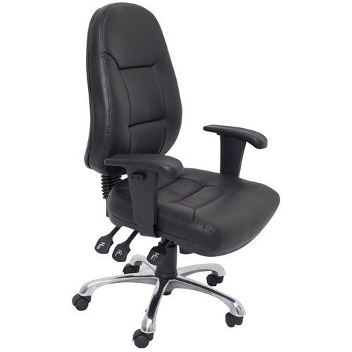 Executive operator chair with high back and adjustable arms. Comes standard with a range of adjustments, seat and back tilt, seat slide for extra seat depth, and ratchet back for easy back height adjustment. Chair Capacity: 130kg. Fully ergonomic Chrome base with adjustable arms and ratchet back. Seat slide. 3 levers. Composition: PU leather seat and back, chrome base. Chair Dimensions: Seat 540W x 450D x Back 580H x Seat 510-590mmH. Indicative Seating Time: 8 Hours. 10 Year Manufacturer's Warranty. Delivery, installation and assembly charges may apply to furniture. Please enquire to confirm.