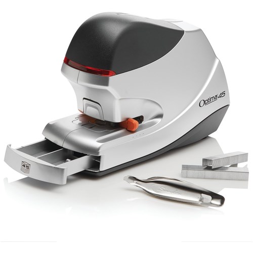 • Optima® 45 Electric Stapler uses Optima® Premium No.56 staples, includes free pack of 1000x Optima Staples.