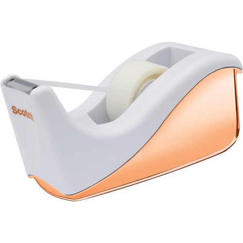 Sleek wave design with rose gold metallic finish. Heavily weighted for easy, one-hand dispensing. Attached tape hub can. For use with 25mm core tapes with up to 33m length. Includes a roll of Scotch® Magic™ Tape 810 19mm x 11.5m.