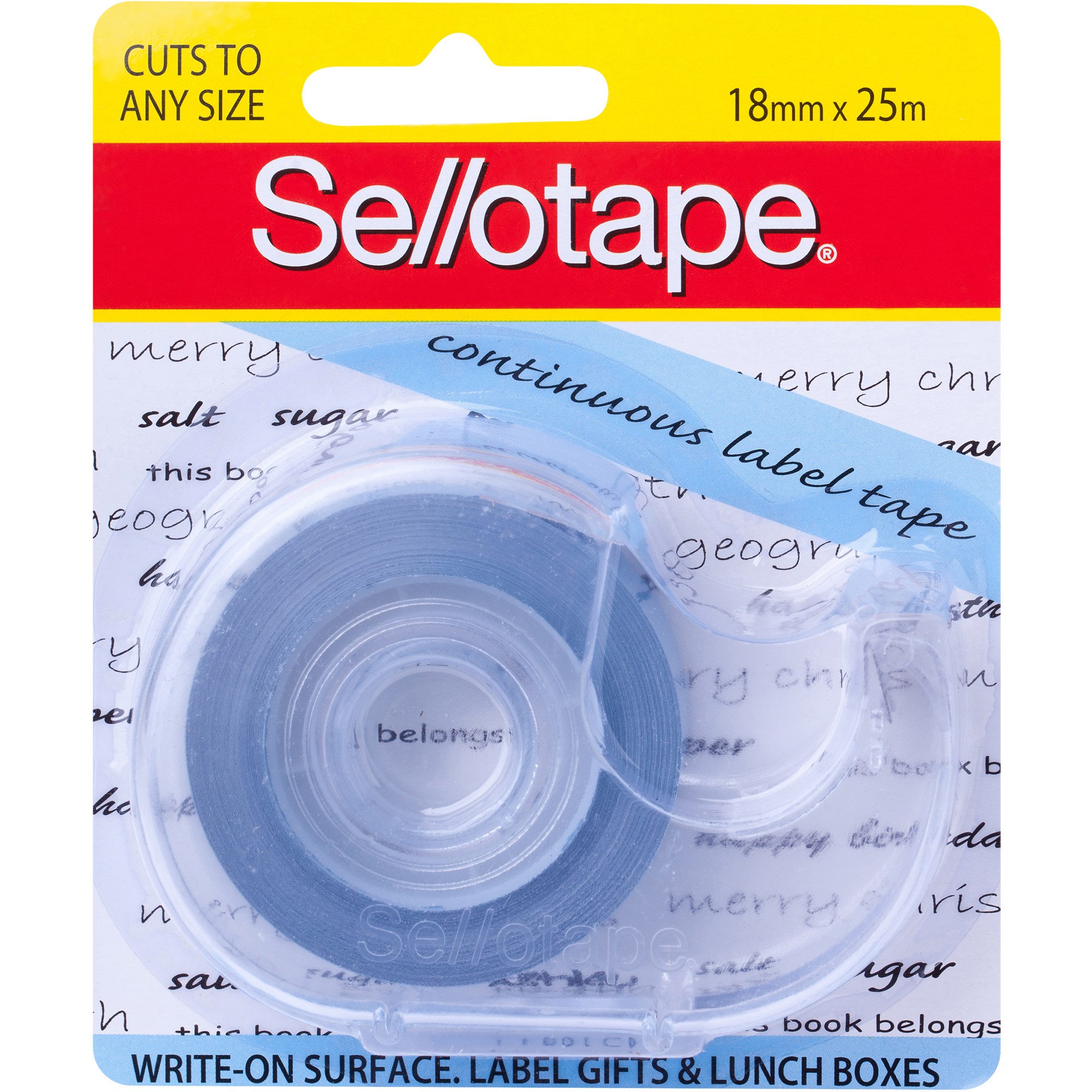 Adhesive tape, with a convenient write-on surface. Ideal for labelling books, folders, containers, lunch boxes, food packages and more. Comes with a convenient clear handheld dispenser for easy cut and apply. Tape width is 18mm. Tape is light blue.