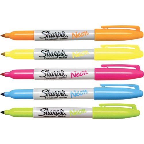 Uncap full-on Neon. Electrify your message, and your audience, with vividly luminous Sharpie Neon Fine Point Permanent Markers. Brilliant in daylight and fluorescent under black light, these Sharpie markers make all of your writing and art pop with electrical impact. Bright in the day, the colors are vivid in natural light. Fluorescent in the dark, the ink glows under black light. Signature Sharpie permanent multi-surface ink writes boldly on paper, plastic, wood, and leather. Quick-drying, AP certified ink formula resists water, smearing, and fading. Tip size: 1.0mm Color: Orange, Green, Pink, Yellow, Blue Pack size: 5