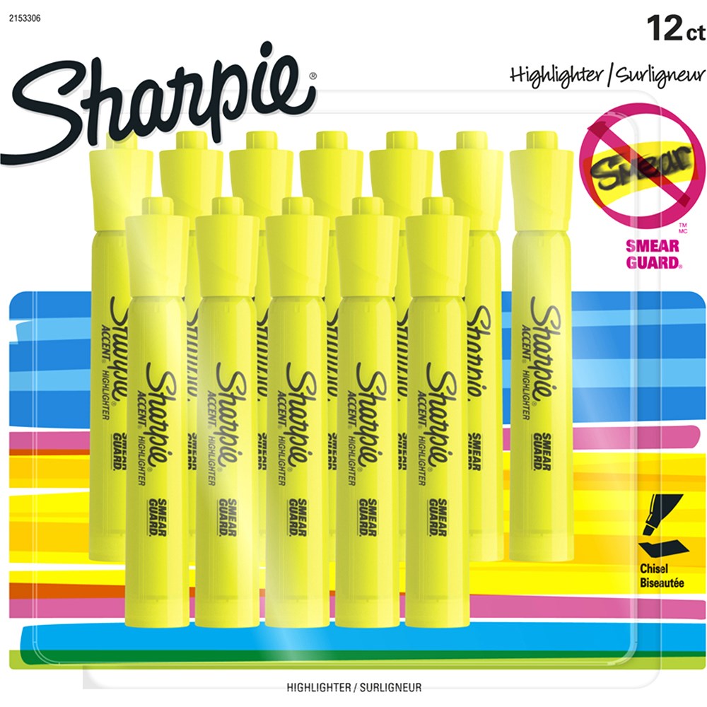 Sharpie Tank Highlighters with wide barrel and large ink supply that delivers dependable highlighting. Bright ink stands out on the page. Versatile chisel tip great for highlighting, underlining, and writing notes. Resists smearing (let ink dry before highlighting). Includes 12 yellow highlighters. Quick-drying, odorless ink is certified AP nontoxic.
