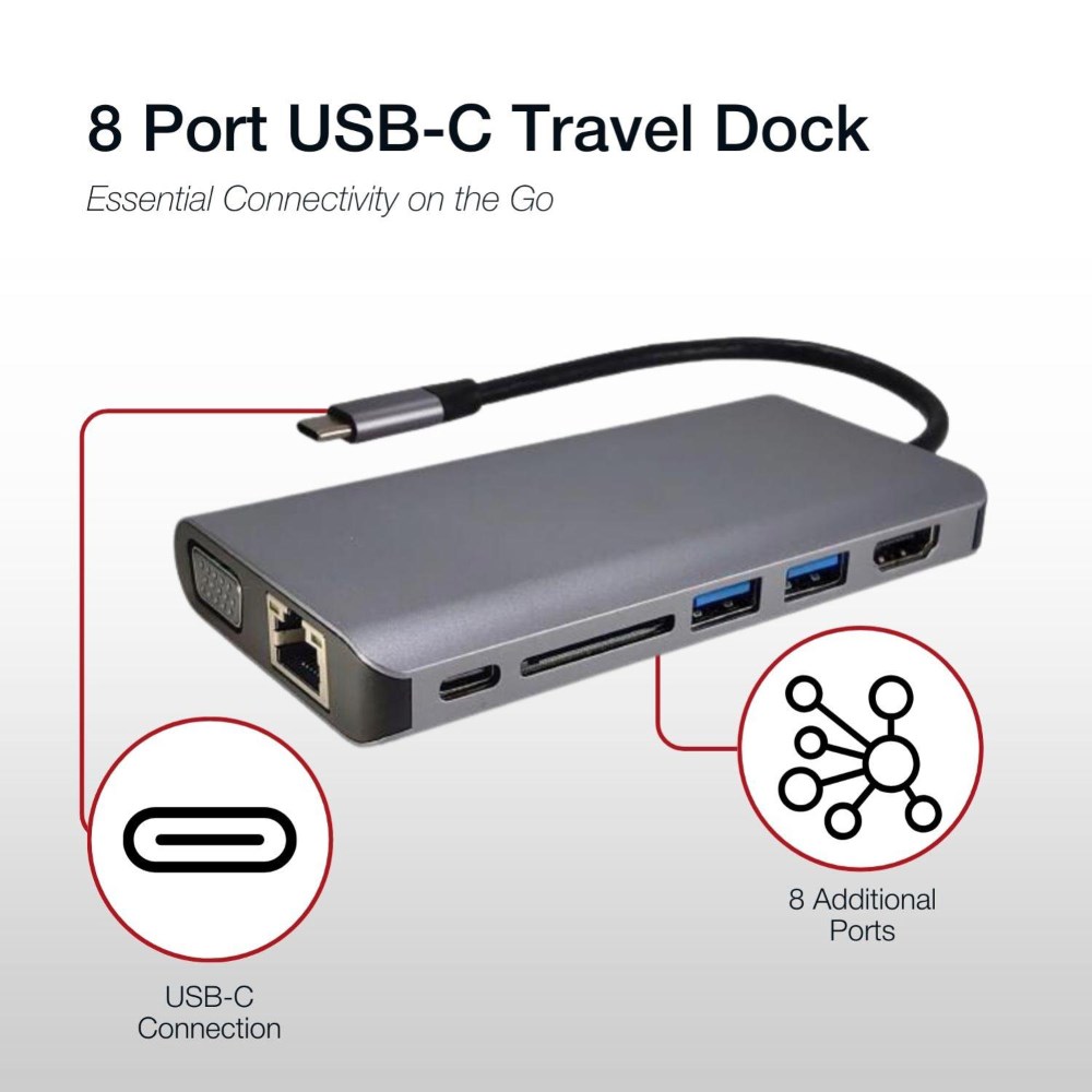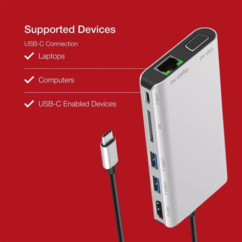 Easily connect to your notebook via USB-C. Connect your Notebook to your Monitor, HD TV or Projector via HDMI or VGA. Use your USB accessories via the 2 x USB 3.0 ports. USB-C port enables both host or charging for PD3.0 devices. Built-in card reader support SD and Micro SD. Connect to a local network with the RJ45 Gigabit Ethernet port that supports 10/100/1000 Mbps Ethernet performance. Support USB-C PD 3.0 with 20V3A 60W power. Compatible with iPad Pro USB-C output+ MacBook USB-C output. 1 Year Manufacturer's Warranty.