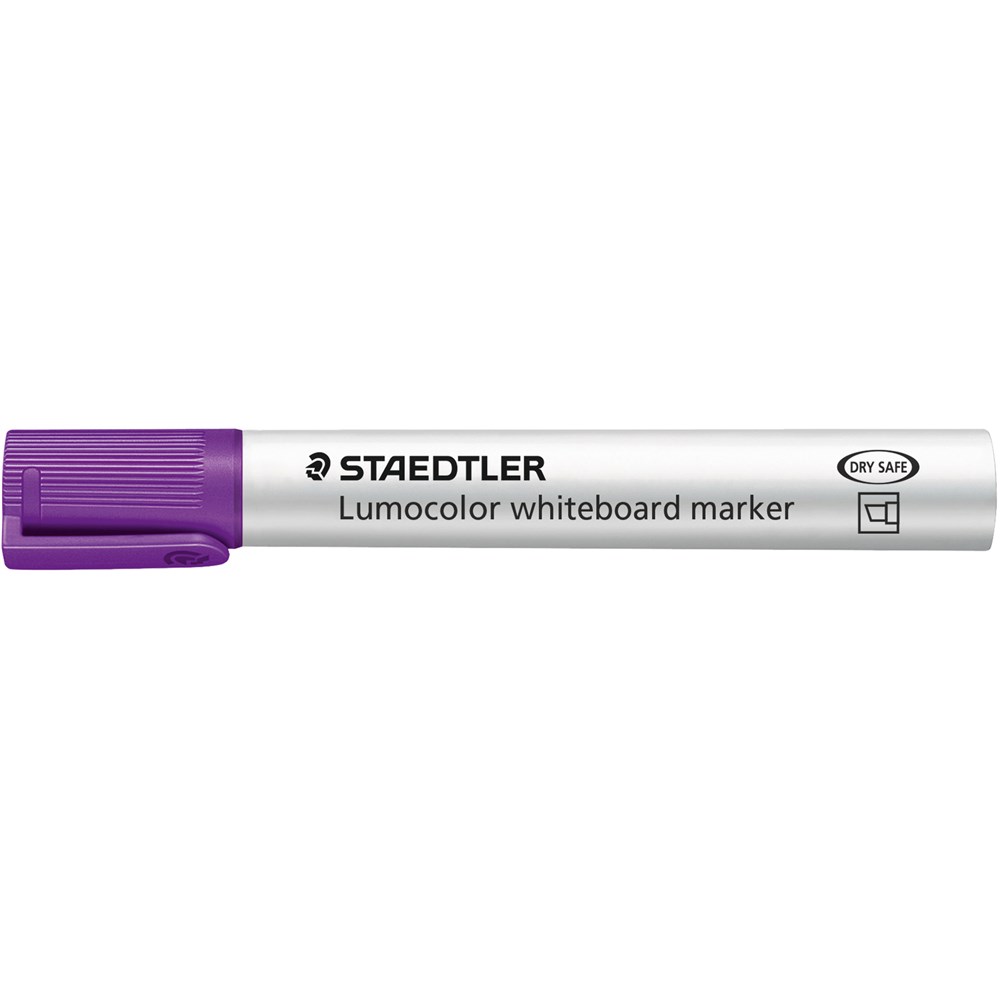 Violet marker can be dry-wiped from whiteboards and surfaces such as glass and porcelain without leaving a trace Airplane-safe Fast drying, low odour and with convenient clip cap Dry safe Stand-up Staedtler box converts to convenient desk set Refillable xylene and toluene free ink Polypropylene barrel and cap guarantee long service life Chisel tip line width approximately 2 - 5mm