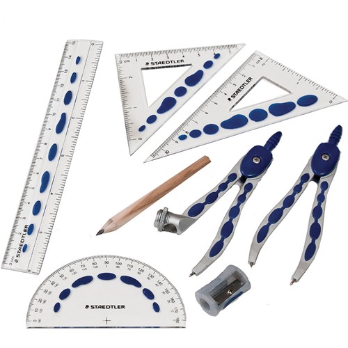 Premium 8 piece maths set with pro grips for an easier hold. Packed in a sturdy plastic storage case. Contains: Metal compass with self centering mechanism and short needle safety point. Single hole sharpener, eraser, pencil. 45 degree set square, 60 degree set square, 15 cm clear plastic ruler. Metal dividers. 180 degree protractor. HB pencil.