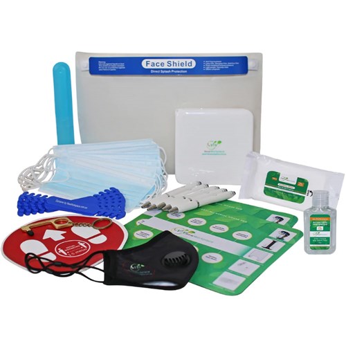 • Contains: 10 x ear savers, silver-ion face mask, face shield, clean carry case, brass key, toothbrush/pen case, 10 x disposable facemasks, floor sign, 2 x clean track mousepads, 5 x safe scribe pens, sanitiser and alcohol wipes.