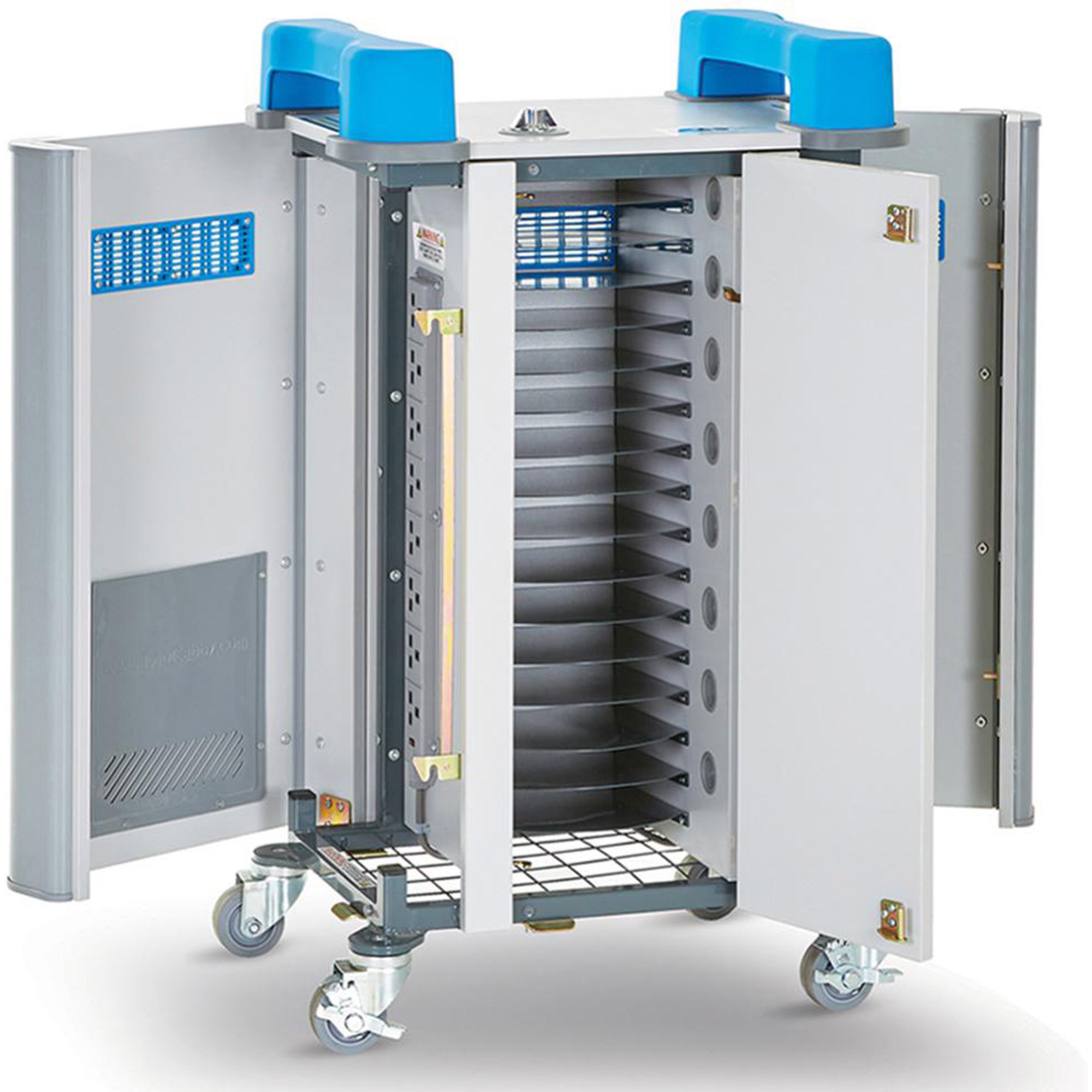 Charges 16 tablets up to 12 Inch screen size. Device adaptors plug into 2 x 8-way power strips designed and manufactured in-house. Sockets accommodate larger adaptors and plugs without blocking adjacent outlets. Cables feed from side power compartment to front device compartment via cable clip portholes, preventing cables being removed from the device compartment. Fitted with large all directional swivel, non-marking hospital grade rubber wheels (2 braked). Thick steel binding plate connects heavy duty wheels to the cart ensuring wheels never buckle or loosen. Built-in heat sensor will shut off power if a device overheats or if interior temperature reaches 32C/90F degrees to prevent risk of fire or damage to devices. Silent ventilation system includes side and rear vents plus a uniquely designed weld mesh base to keep devices cool with constant air circulation without the need for a noisy fan that can spread germs. Power7 Management system preset for 3 daily charging schedules on weekdays with no charging schedules set for weekends, instructions supplied to amend charging schedule easily. Lifetime Warranty (5 years Electrical).