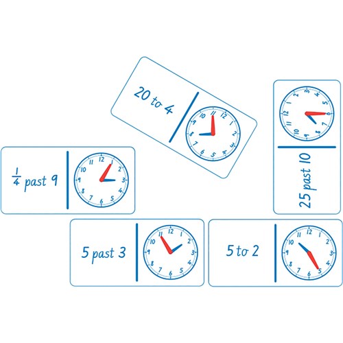 Reinforce the connection between analogue clocks and written time in numbers. Can Features the written time on one side and a clock face with the time on the other side. Dominoes measure 8x4cm while coming in a set of 28 pieces.