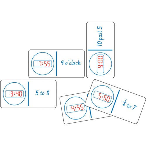 Digital/Numbers Clock Dominoes All the sets work together as the times Each set has 28 plastic dominoes (80x40mm) that help children to learn the 5 minute points of the clock and how to tell when it is quarter past or to the hour.