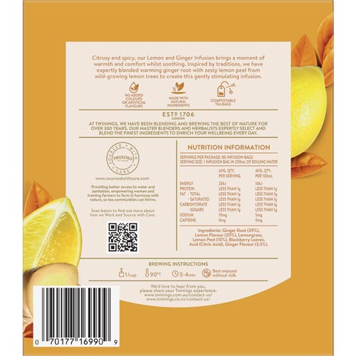 A herbal tea that you can drink on your commute to work, enjoy at home or even serve at a function. To enjoy this tea at its best quality, store in a cool dry place away from odours. The flavour of this tea is lemon and ginger, with hints of blackberry.