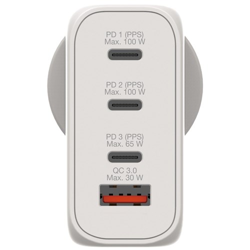 Consolidates multiple chargers into one, combining two USB-C PD 100W ports, one USB-C PD 65W port and one USB-A QC 3.0 port in a sleek palm sized design. Ideal for the office, home or travelling to power your laptop, tablet, smartphone and more. Made with 95 percent post-consumer recycled plastic housing and comes with 100 percent plastic-free packaging. Charges 4 devices simultaneously. Maximum output of 100W. PD1/PD2 ports support up to 100W and PD3 supports up to 65W, when used alone. PD1 maintains a minimum 45W or maximum up to 65W, when being used with other ports. Over Current, Over Voltage, Short Circuit and Over Temperature protection. Ideal for the office, home or travelling to power your laptop, tablet, smartphone, gaming devices, and more. 1 Year Manufacturer's Warranty.
