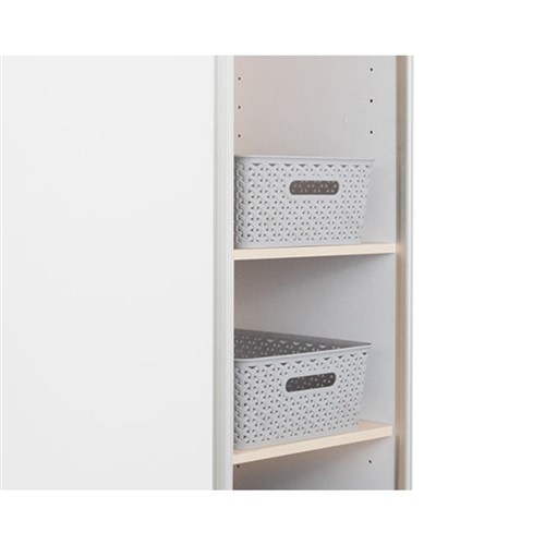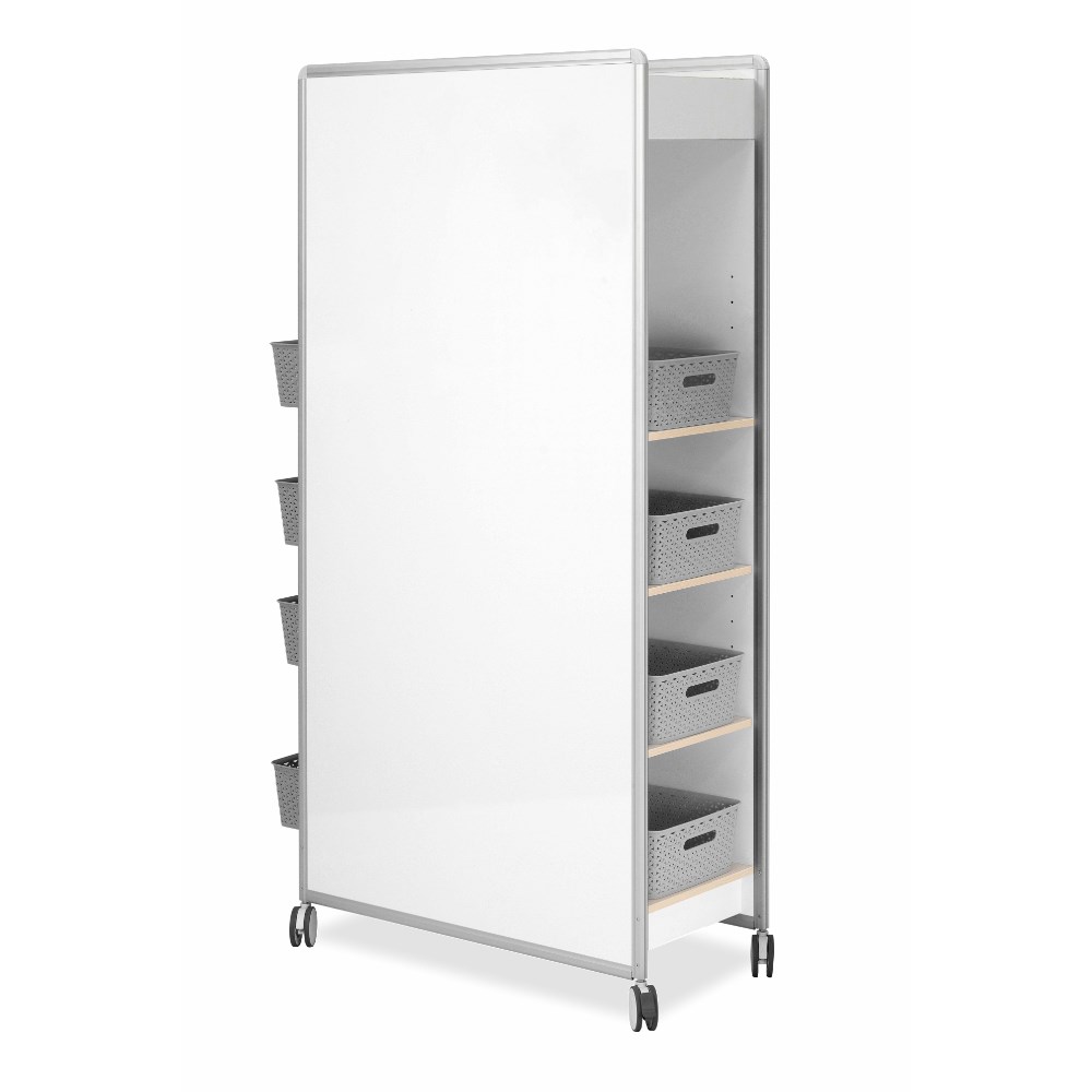 Multi-functional mobile whiteboard wall. Perfect for future focused learning environments. Easily movable double sided magnetic whiteboard with storage that is split into two making it perfect for shared and adaptable learning environments. Each end has two adjustable shelves giving 8 compartments in total for storage. Easy to pull handle on either end. Four large easy glide castors with 2 lockable. Two adjustable shelves each end with one fixed. Delivery, installation and assembly charges may apply to furniture. Please enquire to confirm.