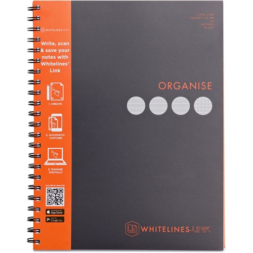 WHITELINES A5 HARDCOVER NOTEBOOK It's simple: dark lines distract, white lines don't. Whitelines Link brings together physical and digital notes. The clever scanner-app in combination with Whitelines Link paper makes it super easy to capture, save and share your notes. (see information link below). A4+ 297 x 225mm. 240 Page/120 Sheet. 3 sections 8mm Ruled + 1 section 5mm Squares. Pages 80gsm with perforation (A4 tear out). Double Wiro Binding 3 Dividers for 4 sections FSC Certified Whitelines Link Compatible Free Smartphone App