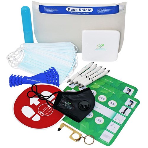 Contains 11 products to allow you to minimise the risk of infecteous disease 1 x Pack of 10 Earsavers to prevent ear strain when wearing your mask for extended hours 1x face shield 1 x Clean carry case designed to clean your facemask by reducing viral and bacterial loads on contact and 1x Antimicrobial bag 1 x Brass key to avoid physical contact with shared surfaces and kill germs on contact 1 x PureCase Personal Toothbrush / Pen Case designed to prevent germs and bacteria from growing on your toothbrush 10 x Disposable Facemasks to control the spread of infections 1 x Personal Floor Sign to maintain physical distancing in your workplace, school or retail store 2 x CleanTrack Mousepads designed to prevent the growth of harmful bacteria